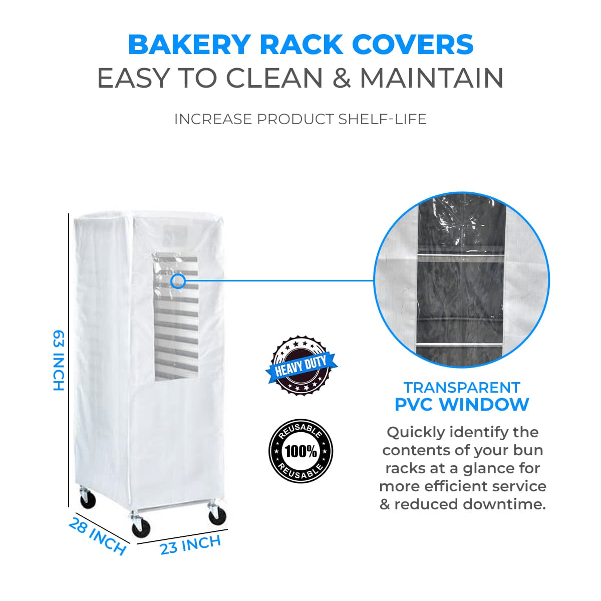 Bakery rack covers come in three different versions, and they have three zippers for easy access to the product and placement over the bun pan racks. The clear vu version is the most economical and offers complete transparency to see the products. The woven rack covers with the window are the most durable, and the woven rack covers without the window are designed for coolers, freezers, and ambient temperatures. The woven rack covers are sewn with a heavy vinyl that is much less likely to tear and be destroyed during use.